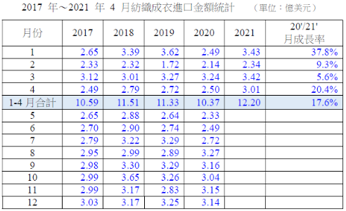 2021年4月中国台湾地区纺织成衣进口金额3.01亿美元,较2020年4月的2.50亿美元成长20.4%;2021年1-4月中国台湾地区纺织成衣进口金额12.20亿美元,较前一年同期的10.37亿美元成长17.6%。