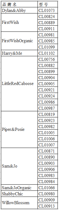 此次召回产品为适用0-6个月婴儿使用的睡袋。涉及品牌为:Dylan&Abby,FirstWish,FirstWishOrganic,Harry&Me,LittleRedCaboose,Piper&Posie,Sam&Jo,Sam&JoOrganic,ShabbyChic,WillowBlossom。有各种颜色、图案。具体召回产品信息如下: