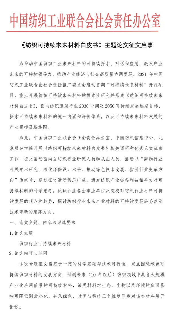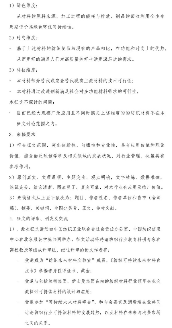 为此,中国纺织工业联合会社会责任办公室开展《纺织可持续未来材料白皮书》相关调研和优秀论文征集工作,征文活动面向全纺织行业研究人员和从业人员,活动以“鼓励行业开展学术研究、深化环保设计水平、推动绿色技术发展、指引行业变革方向”为宗旨,通过征文活动集思广益,激发纺织产业链各利益相关方对可持续材料的科学思考,反映行业各企事业单位及院校对纺织行业材料可持续发展的观点和趋势,探讨纺织行业未来产业材料的可持续发展趋势以及技术革新的思路方向。