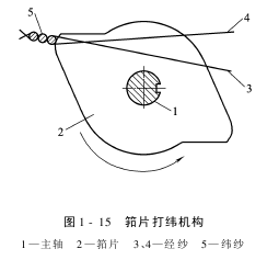 在主轴1上排列着多角形的筘片2,经纱3和4嵌在相邻筘片之间的缝隙中,筘片随主轴回转时,其打纬半径就将纬纱5推向织口。其传动机构简单,运转平稳,适宜于高速运转,但异型筘片制作成本高。