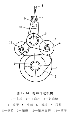 如图1-14所示,打纬共轭凸轮装在左右凸轮箱内,当主轴1回转时,主凸轮2推动滚子4,使得筘座9以摇轴6为中心逆时针摆动,带动钢筘8打纬。打纬完毕后,副凸轮3推动滚子11,使筘座顺时针摆动。当安装在筘座上的走剑板与固定机架上的左右剑带导轨处于平齐时,筘座便静止下来,以利于引纬运动。