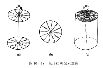 星形架染色机,是目前国内外仍采用较多的丝织物染色设备之一,如图10-17所示。它主要是由一只大染色槽和一个挂绸星形架组成。染槽呈圆柱形或方形,用不锈钢材料制成,可直接和间接加热,还备有循环泵,可使染液循环。织物被一层层挂在星形的挂绸架上,所谓星形架是一只两头有圆盘的金属架。如图10-18(a)所示。圆盘的连接档上装有许多挂钩,织物就挂在钩上。如图10-18(b)和图10-18(c)所示。因为挂绸钩之间相隔一定的距离,所以织物层与层之间也相隔一定距离而互不相碰,由于圆盘的横档通过圆心向外伸展呈放射形似星状,故称星形架。