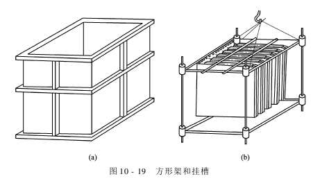 方形架染色机是由挂染槽与星形架的优点综合而成的,其作用和星形架相似,但挂绸比较方便。如图10-19所示。染槽是一方槽,吊架换成了方形架,平幅织物整匹用钢针将两边拴住,每隔数层分开挂在方形架上,每架可挂50g/m2的织物9匹(每匹长40~50m)。用电动吊车把方形架吊入染槽,每个染槽容积1800L,可把方形槽编为一组,成为一条染色生产线。其中,染色槽专门染色(染色残液可续用),后处理槽专门用于水洗及后处理,这样可大大提高生产效率。方形架染色机适用于全真丝织物的染色,其挂绸操作较星形架方便。织物呈松式平幅状态,因而不易擦伤,而且染液的渗透性良好,使染色织物光泽柔和,手感柔软丰满。但此设备容绸量较小,产量较低,也可能产生“刀口印”等疵病。