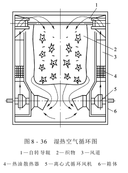 底结构,进出布处均有汽封口,蒸箱内底部有直接蒸汽喷管供汽、给湿。顶部有间接蒸汽保温,防止滴水。湿空气经箱体下部左右两侧的4台离心风机吸入,由箱体两侧夹层风道内的热油加热器加热,温度可达185℃,再从顶部喷向织物,蒸汽按如图8-36所示路线循环。当采用饱和蒸汽汽蒸时,加热器内就不再需要输入热油,而是采用机外水箱填料式饱和蒸汽发生装置,从两侧中部喷射饱和蒸汽,用于常温常压蒸化。