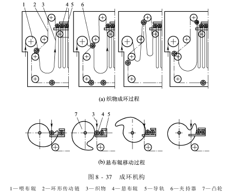 图8-37所示为该机成环机构及织物成环过程图。
