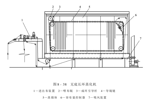 如图8-38所示为无底长环蒸化机,该机工作幅度有1800mm、2200mm、2800mm三种,速度20~60m/min,容布量180m,蒸化时间3~9min,工作温度100~210℃,环长1.5~2.2m。该机蒸化箱箱体为矩形,无底,双层隔板结构。隔板间为蒸汽通道,内置加热器起保温作用,可以避免在箱体上形成冷凝水。由于蒸汽比空气轻,蒸汽浮于蒸箱上部,加上在蒸箱顶部喷出的蒸汽也向下排挤空气,使空气很快从箱体底部排出。箱内为高温蒸汽,箱外为室温空气,在箱体底部因箱内蒸汽凝结形成雾层,使蒸箱内的蒸汽与箱外空气隔开,形成一道自然的汽封口,阻止箱内蒸汽外逸和室外空气进入箱内,而织物则从箱体底部自由进出蒸箱。
