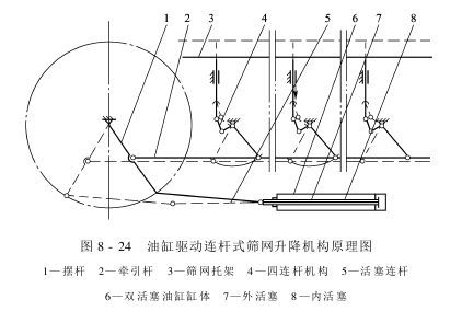 筛网框架的升降运动可由电动机或液压缸驱动,通过曲柄滑块或摆杆连杆机构完成,也有采用气缸驱动的移动凸轮式升降机构。图8-24所示为油缸驱动连杆式筛网升降机构原理图。