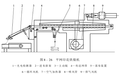 (7)花布烘燥机:印花织物脱离印花导带后,被送到花布烘燥机的传送网带上进行无张力烘燥。传送网带由聚酯纤维单丝织成表面粗糙和透气率很大的网状带。织物在烘燥过程中,不论织物的厚薄、组织的稀密以及印花色浆的渗透性如何变化,都不会导致“搭色”。图8-26所示为平网印花烘燥机的一种形式。由于平网印花机车速较低,烘房容布量较少,一般穿布2~3层,全机热风大循环,进出布在同一端,便于操作。花布由传送网带托持进入烘房,倾斜式的进布架角度可按需要做适度调节,传送网带线速度与印花导带输送织物的线速度保持同步,由红外光电检测后自动调整。烘燥机热源一般为饱和蒸汽,也可采用过热蒸汽或高温载热油,烘房高工作温度120~150℃,由温控装置自动控制。