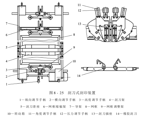 (5)刮印装置:刮印装置是直接影响印花质量的重要单元,分为橡胶刮浆刀(简称刮刀)式和磁性刮浆辊(简称磁辊)式两种。