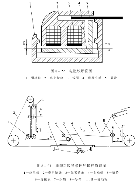 导带夹持器种类很多,常用的有电磁铗、气动铗等。另外还有一种真空吸盘,是在导带下面沿整幅导带吸附的。如图8-22所示,为目前液压传动平网印花机中普遍应用的电磁铗断面图。当需要夹持导带行进时,线圈3通电,吸动磁极夹板4,使夹板顶部压向铗座2的顶面,从而能牢固地夹持导带边缘,使导带5跟随电磁铗行进。磁极夹板设计成倾斜的目的是既要保持小吸距,又要保证导带有足够的脱开距离。