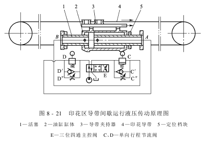 图8-21所示为印花区导带间歇运行液压传动原理图。该油缸的活塞固定而缸体移动,缸体通过连接机件与左右两排若干套导带夹持器相连。当油缸活塞的A侧进油时(压力油经单向阀D流进),推动油缸缸体向右移动,此时夹持器3夹持导带两侧边缘,与缸体同步运行,此时活塞B侧的回油直接通过行程节流阀C,可以大量回油,导带处于高速行进阶段。在导带行进到接近一个花回终止前(图示位置),缸体斜面接触阀C,则B侧回油量逐渐减小,导带就逐渐降速,直至阀C完全关闭,回油就通过节流阀C回入油箱,导带处于慢速爬行,后缸体端部接触定位档块5,缸体行进终止(此时主控阀E处于中间位置),导带就完全静止。每次导带均行进固定的距离。当主控阀换至回程位置,则活塞的B侧进油,A侧回油,缸体向左快速移动,此时由于夹持器松开导带,所以仅夹持器本身随缸体返回原处,而导带则静止不动。