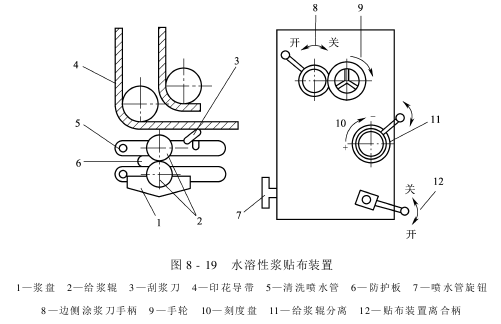 水溶性浆贴布装置,如图8-19所示,是通过两辊给浆装置,由给浆辊将浆槽中的水溶性浆均匀传递到印花导带的表面,织物在压辊的作用下平整地粘贴于导带上。浆层的厚薄可随织物规格品种不同通过调节给浆辊与导带的间隙来调整。适用于亲水性织物和门幅较窄的平网印花机。