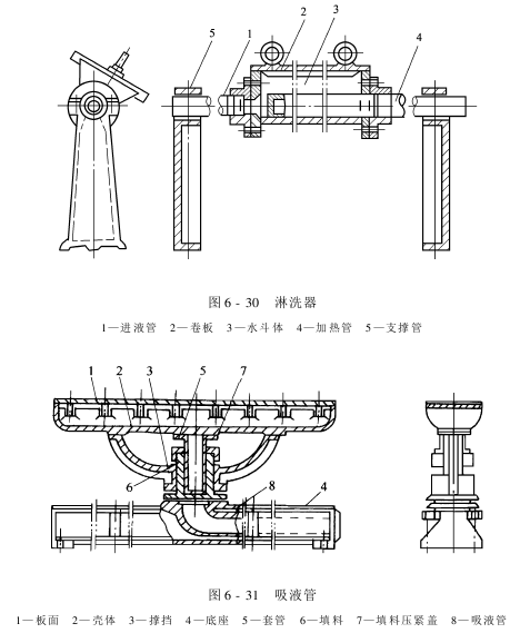 织物在布铗链上扩幅运行1/3后,受到3~4只淋洗吸液装置的淋吸去碱。每只淋洗器(图6-30)自织物上方将热水或热洗碱液淋于织物全幅,然后,再由紧贴织物下方的与真空泵相连的表面布满小孔的吸液管(图6-31)吸去。这是一种使织物处于伸张状态下,采用真空吸液,以强化织物中液体交换的洗涤去碱方法。由吸液管吸下的淡碱液,依次排入机下的各淡碱池内,然后按逐步逆流淋洗的原则,分别由各泵把淡碱池内的淡碱液和来自去碱蒸箱的淡碱液,输送到相应的淋洗器。为了提高淋洗效果,使用的淡碱液温度应尽可能高。但对涤棉混纺织物,温度以不超过70℃为宜。