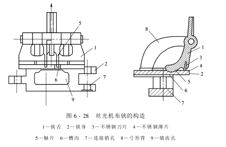 布铗扩幅装置是由左右两条环状的布铗链组成的,长度约15~20m。两条环状布铗链由许多布铗用销子串联,敷设在两条轨道上,可以通过螺丝杆调节布铗链的距离,一般调节成橄榄状,即两头小中间大。两头小便于织物顺利地上铗和脱铗,中间大使织物得以扩幅。布铗是由铗身和铗舌组成的,铗身底座装于轨道上,铗身的上部为弓形背,弓形背端用销子装上铗舌,铗舌的不锈钢刀口与铗身嵌有不锈钢薄片的平面接触。铗舌由铗舌柄、不锈钢刀片和触片等组成,如图6-28所示。