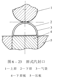 产生高温高压饱和蒸汽的首要条件是能承受一定压力的封闭系统的存在。因此,系统的密封性是高温高压汽蒸设备的关键。它既要保证织物能连续地进出高压汽蒸箱,又要耐磨,具有一定的寿命。如果是间歇生产,则可用静密封来解决,一般用螺栓把箱盖和箱体及填在它们之间的橡胶垫片压紧即可,如高压煮练锅。对于连续生产的高温高压汽蒸的密封,一般有唇式和辊式两种。简单的唇式密封口,是用两片四氟乙烯制成的唇式夹片,用它压触运行织物,形成密封。由于夹片与织物间的摩擦严重,对有色织物易产生条花。在唇封上若积有污物,则将沾污织物。因此,一般不适用于高压染色和印花后织物的汽蒸。图6-23是一种常用的唇式汽封口。上唇由不锈钢制成,下唇为外包聚四氟乙烯薄膜的橡胶充气袋,袋内气压为68.6kPa,使下唇紧贴上唇,织物在其间通过,蒸汽不易外泄。