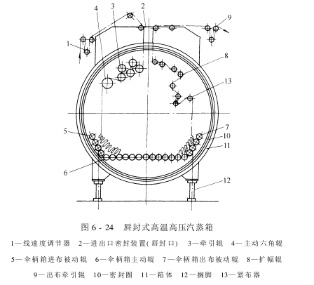 图6-24所示为唇封式高温高压汽蒸箱。织物经唇封口进入卧式圆筒形汽蒸箱后,堆置在主动回转的不锈钢辊组成的辊床(伞柄)上,在高压(196kPa)蒸汽中汽蒸1~4min,导出洗净。它的唇封口结构见图6-25,进机织物和出机织物分别从固定安装的中心支架的两个光滑表面滑过,管形气袋内充入压缩空气后,通过外包聚四氟乙烯唇板,将织物压向中心支架表面,形成密封。