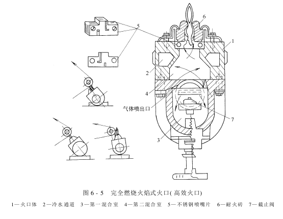 ③完全燃烧火焰式火口:图6-5所示为完全燃烧火焰式火口。铸铁火口体的近火口处,有两条冷却用的冷水通道,用来降低火口体的温度。火口体内有两个混合室。在第二混合室的上方,还安装有多层不锈钢叠片,彼此间形成细小的方孔,上面是由两块能承受骤冷骤热的耐火砖(主要由碳化硅和刚玉黏合后烧结而成)构成的燃烧室和火口。