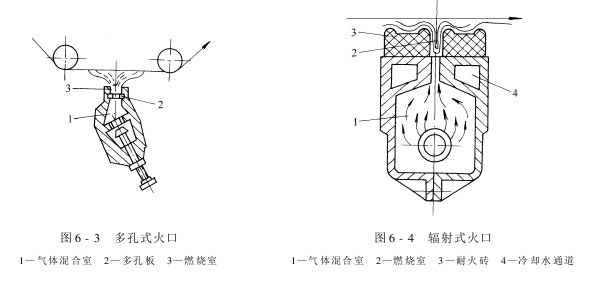 火口的种类很多,主要有有火焰式、辐射与火焰混合式、完全燃烧火焰式、无焰式等。有火焰式火口又有狭缝式和多孔式之分,其中,以狭缝式火口使用广泛。
