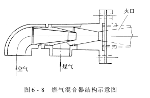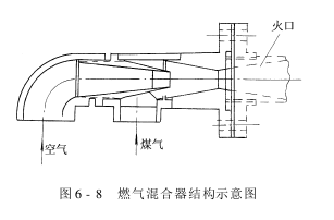 (2)气体混合装置:燃气混合器的结构如图6-8所示。可燃性气体和空气只有在适当的混合比例下才能完全燃烧,从而获得较高的温度。由于空气进口管口径大,出口管口径小,在出口处形成很高的气流,在其周围空间出现负压,把煤气按比例吸入混合,进入扩散管。扩散管的口径是逐渐增大的,混合气的流速逐渐降低,使混合气有一定的扩散混合时间,提高混合程度。