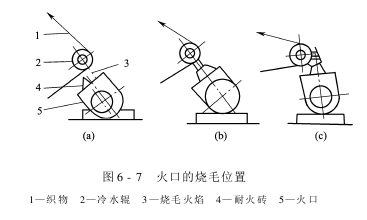 近年来火口向由计算机控制方向发展,可以通过用火焰强度、布面温度、车速以及火口与织物之间的距离等四项参数编制而成的自动控制程序,自动控制火焰强度,利用火口可以转动,能产生不同的烧毛位置,进而可以产生弱烧、中烧、强烧三种效果。如图6-7所示。