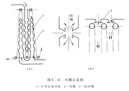 (1)上下导布型导辊式热风烘燥机:如图5-30所示,它由进布架(包括超喂装置)、加热室、风道、烘房、落布装置(包括冷却装置)、传动及自动控制系统等部分组成。加热室在进出布端各有一个,即前加热室和后加热室。各室内有蒸汽加热器(即散热器)、煤气加热器、轴流循环风机等。经加热后的热空气被循环风机吸入增压后送入风道,经风嘴喷出,以提高织物的温度。烘房的前端装有V形长条风管,上有风嘴数十只,其吹出的热风与织物平面垂直,两面对吹,安装在上二下三导辊间,见图5-31(a)。接着,在烘房内的上下导辊间安装短风嘴数十只,热风喷向织物间,与织物平行流动,见图5-31(b),流速随流程的加大而迅速降低,烘燥效率较低。