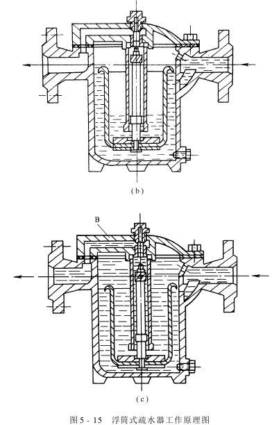 ①浮筒式疏水器工作原理:浮筒式疏水器的结构如图5-14所示。图5-15是它的工作原理图。当冷凝水和部分蒸汽进入疏水器时,由于水的浮力使浮筒上升,截止阀关闭,阻止水蒸气泄漏,见图5-15(a)。随着冷凝水的不断流入,水位逐渐升高,当液面上升到一定高度时,即溢入浮筒,见图5-15(b)。当浮筒中冷凝水的重量超过浮筒所受的浮力时,使浮筒下沉,打开截止阀,浮筒中的冷凝水在蒸汽压力下经套管、截止阀和调节阀排出,见图5-15(c)。当排出一定量冷凝水后,浮力又使浮筒重新上升而关闭截止阀,冷凝水不断地流入,又进行第二次循环。