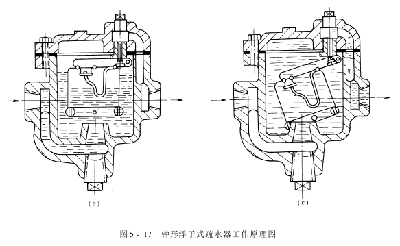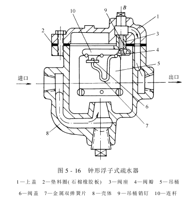 ②钟形浮于式疏水器工作原理:图5-16所示为钟形浮子式疏水器,它由壳体、上盖、阀门、金属双弹簧片、吊桶(即钟形浮子)及连杆等组成。这种疏水器是利用金属弹簧片受热弯曲的特性来阻汽排水的。