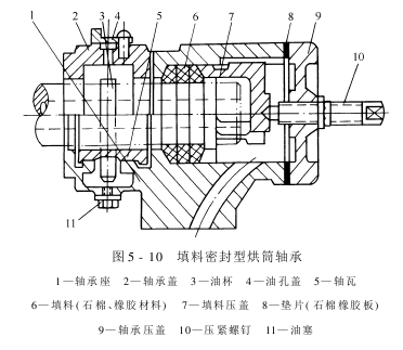 (1)填料密封型烘筒轴承:如图5-10所示。蒸汽经轴承座的进汽孔,直接进入烘筒轴头内孔。调节压紧螺钉,通过压盖压紧螺旋形石棉橡胶填料,形成径向收缩,并与轴头形成转动的圆柱形密封。这种密封对烘筒轴头的回转阻力较大,易磨损,增加了传动功率的消耗。但由于它结构简单,加工、保养及维修都比较方便,安装要求也不高,因此,虽然比较陈旧,目前仍在使用。