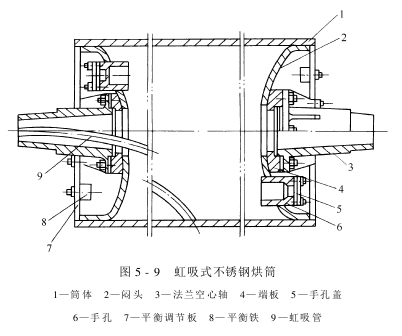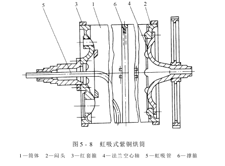 (2)虹吸式紫铜烘筒:其结构如图5-8所示。它与水斗式紫铜烘筒的主要差别在于排水方式的不同。水斗式烘筒是依靠冷凝水的自重排水,而虹吸式烘筒则是利用虹吸作用排水。虹吸管是一根一端弯曲的黄铜管。开车时,烘筒内存积的冷凝水由蒸汽压入虹吸管,随后,依靠虹吸作用和蒸汽压力,就可不断把冷凝水排出烘筒外。显然,虹吸管弯曲端与烘筒内壁的间隙越小,运转中筒内残留的冷凝水也就越少,烘燥效率也就越高。但是,由于虹吸管另一端固定在进气盖端,形成较长的悬臂,刚性较差,为了防止擦伤筒壁,其弯曲端与烘筒内壁应保持一定间隙,虹吸管与烘筒内壁的距离一般应控制在5~8mm。