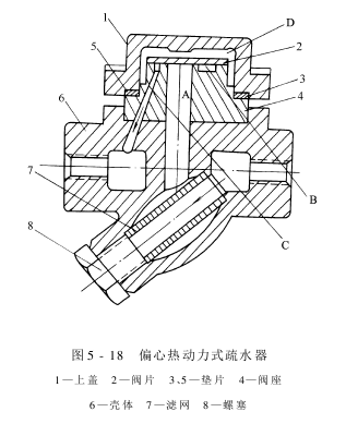③偏心热动力式疏水器工作原理:图5-18所示为偏心热动力式疏水器。它主要由壳体、上盖、阀片、阀座滤网等构成,利用热动力学原理来阻汽排水。