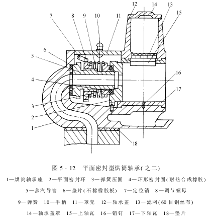 图5-12所示为另一种结构的平面密封型烘筒轴承。它的密封主要是依靠弹簧和压圈,压紧平面密封环,使它紧贴轴头端面而形成密封。环形密封圈的作用是防止蒸汽从蒸汽导管的外圆漏出。这种平面密封结构的密封性能较好,使用寿命长,转动功率消耗少,烘筒颈不易被磨损。目前水斗式烘筒普遍采用这种密封形式。