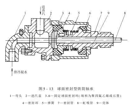 (3)球面密封型烘筒轴承:如图5-13所示,安装在烘筒滚动轴承的外部,密封管与烘筒轴头由螺纹紧密连接。蒸汽从进汽盖经密封管进入烘筒轴头内孔而入烘筒,其转动密封是由固定球面密封环与密封环、密封管之间的球面摩擦来实现的。弹簧压紧两摩擦球面而不致漏汽。冷凝水由虹吸管经出水弯头排出。