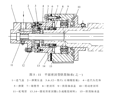 (2)平面密封型烘筒轴承:图5-11所示为采用固体润滑材料的端面密封,其主要特点是将烘筒轴头的支承由前面的滑动轴承改为滚动轴承,减小了摩擦,提高了传动效率。转动密封采用塑料石墨压铸件的端面密封形式。采用虹吸管排除冷凝水。