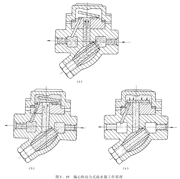 当冷凝水由进口处经滤网流入A孔,到阀片下方时,由于变压室D、环形槽B和出口管道C中的蒸汽,因温度下降而冷凝使压力 降低。在蒸汽压力的作用下,冷凝水顶开阀片,经环形槽B,从C孔排出,见图5-19(a)。