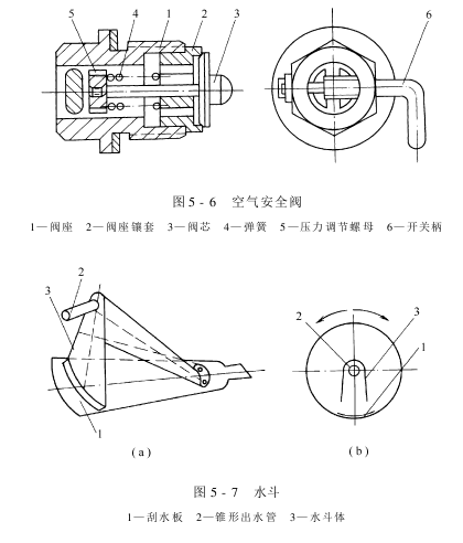水斗结构如图5-7(a),其工作原理如图5-7(b)。水斗用2~3mm紫铜板焊接制成,用于排除烘筒内的冷凝水。刮水板焊接在筒体的内壁上,与水斗体连接的锥形出水器插入法兰空心轴(图5-5)的中心孔。在烘筒转速较低的情况下,冷凝水因自身重量而集中在烘筒的下部。