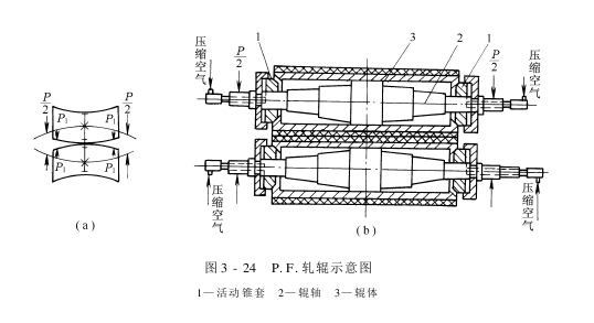 图3-24所示的P.F.轧辊,是由日本制造的。上、下轧辊为同一结构。一对中固轧辊,在加压后弯曲变形,形成线压力中间大、两端小的状况,如图3-24(a)所示。在辊体两端内侧各装一套附加加压装置,如图3-24(b)所示。它由安装在辊体两端内孔中的锥形套筒和可在辊轴上沿轴向滑移的锥形块组成。从辊轴轴头中心孔通入的压缩空气,能使锥形推块沿轴向向辊体内移动。其锥形面压向锥形套的内侧面产生一横向的附加压力,改变了辊体端部的变形。调节压缩空气的压力,就可调节横向矫正变形的附加压力,与轧压压力相适应。锥形推块和套筒的锥度不能大,否则,横向矫正就小;但也不能太小,因要产生自锁,一般取10°左右。