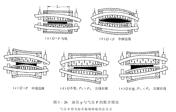Küsters轧辊不仅能产生很好的匀轧效果,而且,通过调节内腔油压力p,可使辊体内壁承受的总压力改变,取得各种不匀轧效果,以适应各种特殊工艺的要求,如图3-26所示。