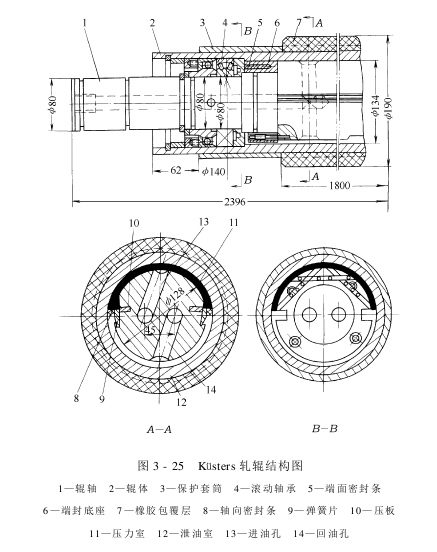 图3-25是德国Küsters轧辊的结构图。辊体安装在轴承上,绕固定不动的辊轴转动。辊轴和辊体之间的空腔,由端面密封条和轴向密封条分隔为两室。在轧点一侧的半环形空腔,称为压力室;在轧点另一侧的半环形空腔,称为泄油室。压力油由轴端上的进油孔进入压力室。泄漏入泄油室的油则经轴上的回油孔流回油箱。