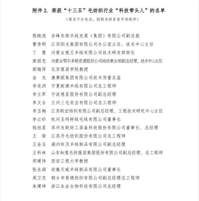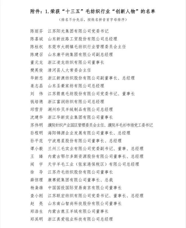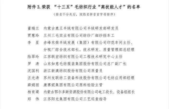 中国毛纺织行业协会会长刘家强宣读了《中国毛纺织行业“十三五”期间管理和科技创新先进人物推选决定》,决定授予陈丽芬等25名同志“十三五”毛纺织行业“创新人物”荣誉称号;程晓虎等19名同志“十三五”毛纺织行业“科技带头人”荣誉称号;董瑞兰等10名同志“十三五”毛纺织行业“高技能人才”的荣誉称号(名单附后)。