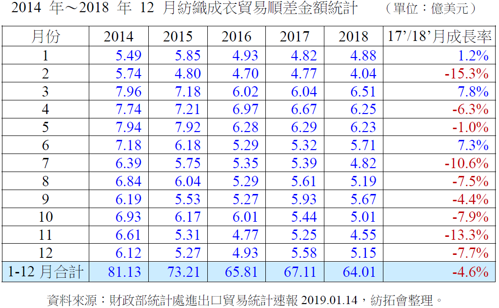 贸易顺差:2018年12月台湾纺织成衣产品贸易顺差(=出口金额-进口金额)金额为5.15亿美元,较前2017年12月5.58亿美元衰退7.7%;2018年1-12月台湾纺织成衣贸易顺差64.01亿美元,较前一年同期67.11亿美元减少4.6%。