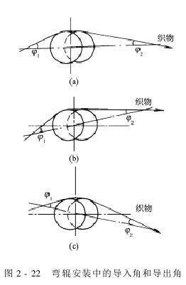 弯辊的安装位置直接影响其扩幅效果。首先,弯辊的弧突方向必须与织物的运行方向一致,才能起到扩幅作用,否则,将使织物纬向发生收缩。其次,织物与弯辊的包角越大,扩幅能力也越大。但包角不能大于180°,否则,也会使织物纬向产生收缩而起皱。再次,对织物的导入角φ 一定要大于导出角φ ,见图2-22(a)、图2-22(b),这样,可防止织物边缘与弯辊接触松弛,从而增强扩幅力。在安装弯辊的前后导布辊时,一定要注意这一点。另外,当弯辊中部向下倾斜时,能使φ >φ ,见图2-22(c),扩幅力增大。因此,适当改变弯辊芯轴的安装位置,可调节弯辊扩幅器的扩幅能力。
