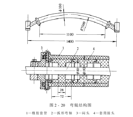 弯辊扩幅器一般由1~5只弯辊组成。在实际生产中常用的是三弯辊扩幅器。弯辊扩幅器的主要组成部分是弯辊,其结构如图2-20所示。从外表看,弯辊是一根完整而具有一定弹性的弧形橡胶辊,在织物带动下,能绕其弧形轴芯线回转。从弯辊的内部结构看,它由辊芯和辊体两部分组成。辊芯的中部是一根弧形芯轴,在其上通过滚动轴承安装有多节圆柱形套筒,在相邻两套筒间由各自端面上的套齿依次嵌接相连。在芯轴上套有多节胶木或铸铁衬套,并用键固定在芯轴上,可以避免芯轴受到磨损,整个辊芯套在橡胶套中。这样,一方面可以防止辊芯的轴承漏油和多节套筒嵌接处积污;另一方面可以增大辊面与织物的摩擦,提高扩幅能力。