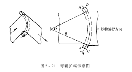 弯辊扩幅的原理是当织物以一定的压力紧贴弯辊辊面,并按图2-21所示的方向运行时,由于织物与辊面间存在静摩擦力的作用,使织物的纬向幅度随弯辊母线由AB位置转到CD位置时,弯辊的母线增大。因此,织物纬向幅度也就随之增大,即产生了扩幅作用。