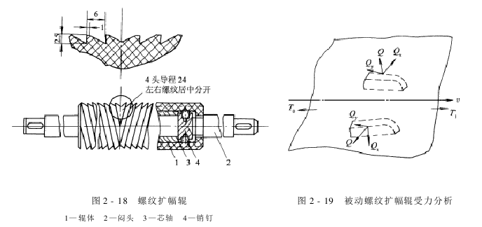 Q力垂直于H面,将Q沿织物的经向和纬向分解为Qy 和Qx 两个分力。Qx 分力使织物沿纬向伸展,产生扩幅作用。相反,在图2-17中,如果织物向相反方向运行,织物将与螺纹的另一面x 将使织物沿纬向收缩。