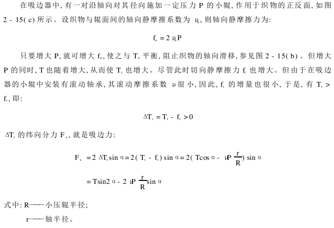 ②要平衡Ta ,必须提供足够大的轴向静摩擦力fa ,因此P必须足够大。否则,不仅影响吸边,甚至会起皱或逃边。但是,P也不能过大。因为,P过大不仅会在织物上产生压痕,还可能影响织物纤维的坚牢度。因此,在安装吸边器时,要根据织物的品种和α角度,认真调节小辊间的压力P。