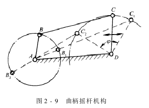 曲柄摇杆机构如图2-9所示,是由四根构件用铰链互相连接而成的。其中,AD构件固定不动,称为机架。AB构件与机架相连接,能做圆周回转运动,称为曲柄。CD构件也与机架相连接,但只能做一定角度φ的摆动,称为摇杆。当曲柄AB做圆周运动时,摇杆CD便以一定的角度φ做往复摆动。当曲柄AB与连杆BC成一直线时,摇杆便处于摆动的极端位置。图中C1 是右极端位置,C2 是左极端位置。这里必须指出,一定要在AB小于CD的情况下才能起作用。
