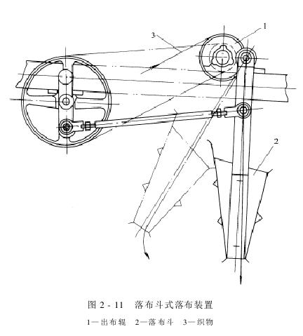 在某些情况下,也有用落布斗代替落布辊的平幅出布装置,如图2-11所示。这种落布斗式平幅出布装置,适合于高支纱的高档轻薄织物,可以避免布面擦伤及产生松弛飘荡现象。