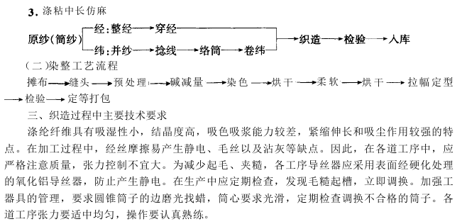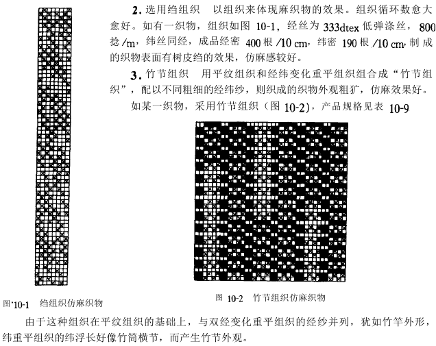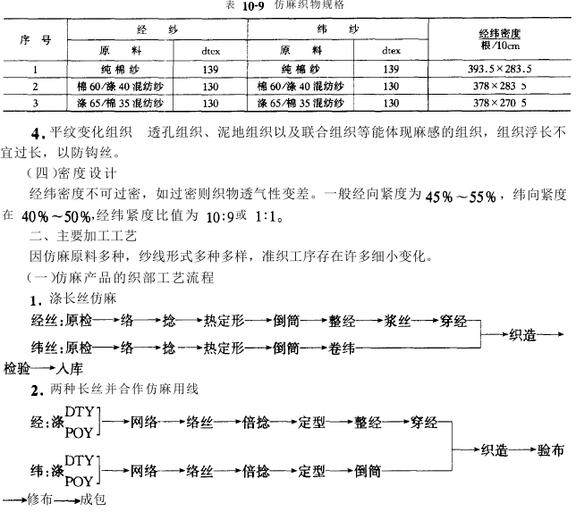 1.麻纤维的结构特性 麻纤维的纵面大都较平直,有横节、竖纹,单纤维较棉短,纺纱要在半脱胶下进行,故纱支较粗,条干不匀率较高,呈现竹节状。因此选用涤纶低弹丝、涤纶竹节丝、涤纶不规则牵伸丝(理化丝、双色丝)、涤纶竹节纱、涤纶疙瘩纱等原料,其外观接近麻纤维纱,仿麻效果较为理想。