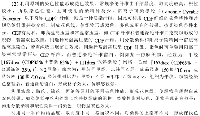 2.染整处理后的麻粒效应 由于麻纤维只含60%~80%的纤维素和半纤维素,含有比棉多的木质素、果胶、脂肪及蜡质灰分和糖类物质,其染色较棉纤维困难,匀染性也较棉纤维差,大多染浅色,经后处理后外观呈现麻粒状效应。故可选用以下原料:原液丝和普通丝的组合丝;普通涤纶丝和涤纶改性丝、异形丝组合丝;涤纶与腈纶、锦纶、丙纶等组合丝或复合丝;涤纶DTY丝与FDT丝或FDT丝的组合丝。通过加捻染色处理后产生的麻粒效应,使其外观粗犷,从而达到仿麻效果。