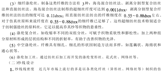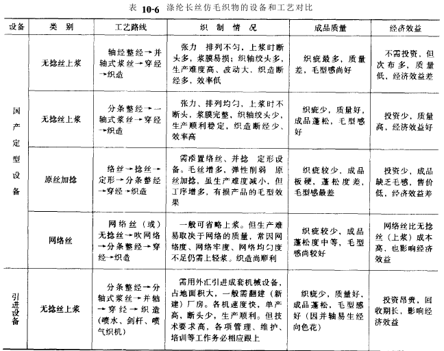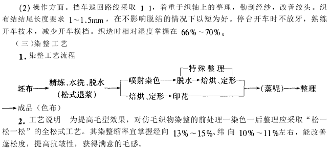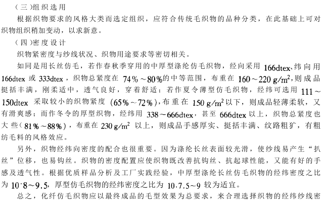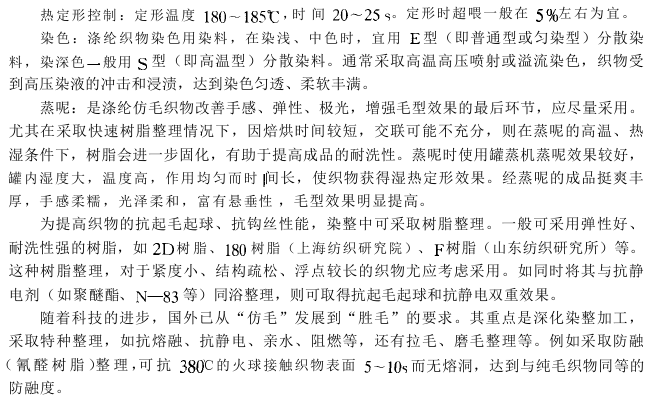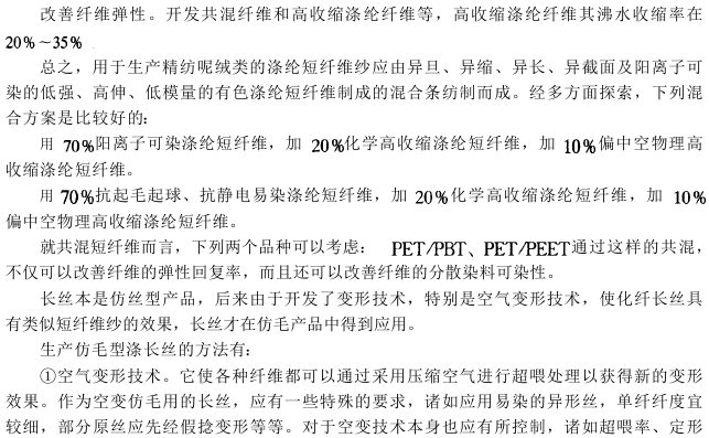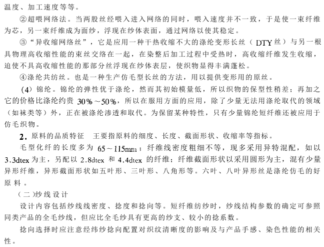 做到化纤仿毛,原料选择与开发至关重要。早年的不对称凝固、复合纺丝等技术,就是为仿毛所开发的技术;随着变形技术,特别是空气变形技术的引用,化纤长丝仿毛也已进人生产领域。但目前仍以化纤短纤为主要仿毛原料.